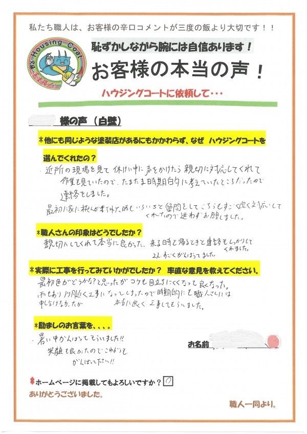 S様の本当の声! *他にも同じような塗装店があるにもかかわらず、なぜハウジングコートを選んでくれたの? 前回から年数が経っておりそろそろ塗り替えないといけないと思っていたところチラシが入っており数社連絡をしました。 相見…