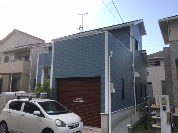 福岡県筑紫野市紫のA様邸で外壁をブルーグレーベースに塗り替え、屋根も外壁に合わせた色を取り入れ塗装しました。8/26完成です。【ホームページより】
